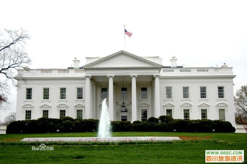 白宫是美国总统府,坐落在华盛顿市中心的宾夕法尼亚大街,与高耸的华盛顿纪念碑相望,是一座白色的三层楼房,因其外墙为白色砂岩石,故而名为白宫。